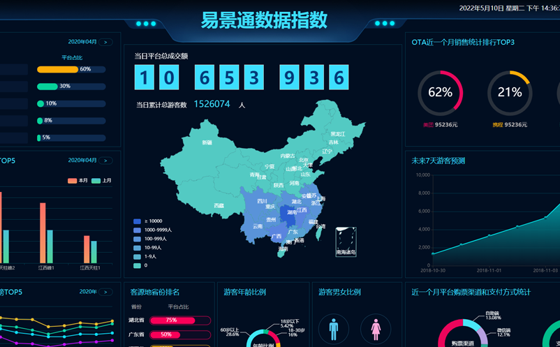 景区在安装鼎点注册分景区大数据平台后,可通过数据可视化大屏,识别游客需求,判断重点客源市场,分析景区游客画像,提升游客满意度,助力景区运用数据进行决策分析。