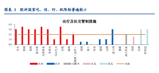 从全球视角来看,亚洲普遍偏向慎重的疫情管控政策:华创证券研究显示,亚洲国家无论是在出入境限制,还是国内出行和社交管制,整体都比欧美要严格。